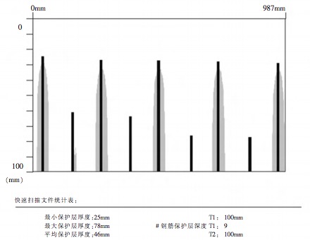 2.2 混凝土強(qiáng)度及鋼筋信息檢測(cè) 混凝土強(qiáng)度采用回彈儀進(jìn)行檢測(cè),水泥管鋼筋數(shù)量、間距及保護(hù)層厚度采用PS200鋼筋探測(cè)儀進(jìn)行檢測(cè),F(xiàn)場(chǎng)無(wú)損檢測(cè)情況見(jiàn)圖 3、圖 4,圖5為雙層縱筋保護(hù)層厚度、間距、鋼筋掃描圖像,圖中縱坐標(biāo)為保護(hù)層厚度,橫坐標(biāo)為鋼筋間距,線條為鋼筋圖像。 ![]() 圖3 回彈法檢測(cè)混凝土強(qiáng)度 圖4 鋼筋信息檢測(cè) 由于水泥管縱筋及環(huán)向鋼筋在管內(nèi)、外側(cè)均雙層配置,因此,內(nèi)外鋼筋位置、保護(hù)層等信息以圖像高低不同進(jìn)行區(qū)分,即圖像較高(保護(hù)層厚度較。橥鈧(cè)鋼筋。 ![]() 圖5 雙層縱筋保護(hù)層厚度、間距、鋼筋圖像 圖6 環(huán)向鋼筋分布 圖6為環(huán)向鋼筋信息掃描圖像,因鋼筋探測(cè)儀根據(jù)電磁感應(yīng)原理工作,檢測(cè)時(shí)探頭應(yīng)垂直于鋼筋位置,而水泥管的環(huán)向鋼筋與縱軸線有一定傾斜角度,故鋼筋檢測(cè)掃描圖像中縱坐標(biāo)保護(hù)層厚度非直線,說(shuō)明保護(hù)層厚度因角度不同存在偏差,但呈對(duì)稱分布,中間最高處為環(huán)向筋實(shí)際保護(hù)層厚度,水泥管混凝土強(qiáng)度及鋼筋檢測(cè)結(jié)果見(jiàn)表2。