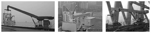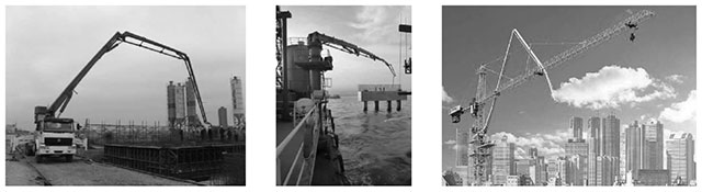 2.6 混凝土布料機(jī)械 混凝土布料設(shè)備是商品混凝土泵送到施工澆筑層后將混凝土送達(dá)澆筑部位的關(guān)鍵設(shè)備,我院在全國最早研發(fā)成功系列布料幅度為10m~32m的液壓式混凝土布料機(jī),包括移動(dòng)、固定、船載、內(nèi)爬、樓板爬升、車載、輪式、履帶式、快裝等型式,其中HGY10型混凝土布料桿獲1999年建設(shè)部科技進(jìn)步三等獎(jiǎng);承擔(dān)了國家級課題“鐵路現(xiàn)澆梁專用混凝土布料機(jī)”和“九五”科技攻關(guān)項(xiàng)目“起重、布料兩用塔機(jī)的研究”,該成果達(dá)到國際先進(jìn)水平,獲建設(shè)部科技進(jìn)步二等獎(jiǎng)。 車載式混凝土布料機(jī)見圖17,船載式混凝土布料機(jī)見圖18,起重、布料兩用塔機(jī)見圖19。 ![]() 圖17 車載式混凝土布料機(jī) | 圖18 船載式混凝土布料機(jī) | 圖19 起重、布料兩用塔機(jī)