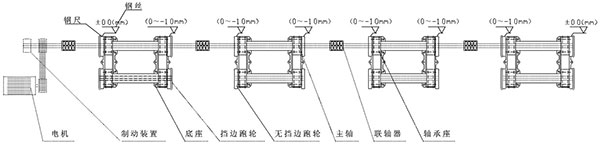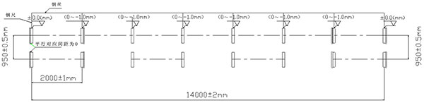 第二次調(diào)整:①卸下全部的夾軸器,按照以上粗調(diào)的步驟來精調(diào)離心機(jī)的水平精度;②調(diào)整要求:水平方向,調(diào)整主、從動輪軸承座旁的調(diào)節(jié)螺釘使主動軸與副軸中心線在同一水平面上間距為950mm,兩端的寬度差(平行度)≦±0.5mm;垂直方向各輪的水平度誤差±1mm,前后輪略高0.5mm;調(diào)整各組跑輪使長度方向中心距為2000mm±1mm,總托輪距累積誤差≦±2mm。③帶擋邊主、副輪與模具接觸面要對應(yīng)對齊,調(diào)整后要鎖緊,防止工作時移位(圖示一);④底部的墊鐵、斜鐵要打緊,緊定好螺母,重新裝好夾軸器,進(jìn)行第二次灌漿。