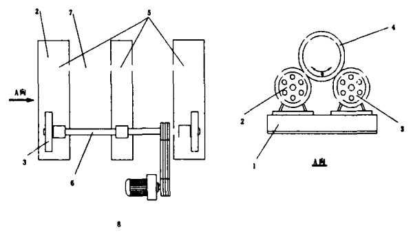 一、半圓形水泥管成型機的研制 1.1 生產(chǎn)工藝原理 與普通離心水泥制品成型的不同點就是在離心過程中增加了振動環(huán)節(jié)。按照約定,產(chǎn)品必須滿足一定的抗?jié)B要求,而普通離心工藝無法滿足該水泥管混凝土的密實度要求。因此,研制時在離心過程中增加了振動工序,對正在高速旋轉(zhuǎn)的水泥管模具及模具內(nèi)混凝土施加高頻振動,使混合料中的碎石、砂、水泥和水得到一定的合理分布,提高混凝土的密實度。振動裝置是在水泥制管機一側(cè)安裝四個帶有刻槽的油壓振動輪,分布于水泥管的兩端和中間部位,在液壓油缸的推動下與水泥管模具跑輪接觸產(chǎn)生振動力,實現(xiàn)離心振動。同時振動時四個振動輪可同時開啟也可分別振動,在分料時隨著布料進度而分別開啟相應位置的振動輪,中速振動時,可全部開啟振動;并可根據(jù)管徑的大小,采取不同的振動時間。振動時間通過操作控制臺來實施控制。 1.2 半圓形水泥管成型機的主要設備 半圓形預應力水泥管成型機包括以下幾個部分:①高頻振動離心機;②水泥管模具;③鋼筋加工設備;④混凝土攪拌站;⑤混凝土布料機;⑥蒸汽養(yǎng)護系統(tǒng)。 1.2.1 離心系統(tǒng) 離心系統(tǒng)包括離心電機、托輪及托架兩個部分。離心機采用的支承方法為托輪式,依靠磨擦力帶動模具跑輪旋轉(zhuǎn)。振動系統(tǒng)包括托架、液壓油缸、振動輪幾個部分(附圖)。 ![]() 附圖 雙托輪式離心機組型式 1、底座;2、被動托輪;3、主動托輪;4、鋼模板;5、軸承座;6、主動軸;7、被動軸;8、調(diào)速電機; 1.2.2 離心振動工藝中的離心速度 在振動離心成型中,所要控制的工藝技術參數(shù)主要是離心速度與離心時間的問題。包括低速振動布料、中速振動成型和高速離心密實排漿3個工序。對應的離心速度分為低速、中速、高速,3個階段應計算出相應的轉(zhuǎn)速和控制時間。 低速布料時,水泥管模具轉(zhuǎn)動速度控制在120r/min左右,對應的電機轉(zhuǎn)速為150r/min。布料時間隨水泥管型號不同所需混凝土量而變化,一般控制在5~20min。采用低速布料是易于觀察縱向及四周方向布料的均勻程度,達到初步成型的目的。 中速離心成型與振動時的水泥管模具轉(zhuǎn)速一般控制在250~350r/min,不同型號的水泥管通過控制模具的線速度來實現(xiàn)混凝土相應的離心力和振動力。此階段的時間控制在1~4min。采用振動布料方法,可加快布料速度,同時解決布料不均勻的缺陷。 高速離心轉(zhuǎn)速一般控制在520r/min,對應的電機轉(zhuǎn)速為650r/min。此階段的時間為5~15min。高速離心的目的是為了達到密實、排漿,析出多余流離水和增加內(nèi)壁光潔度的目的。 研制完成后的振動離心機主要技術參數(shù)見表1。