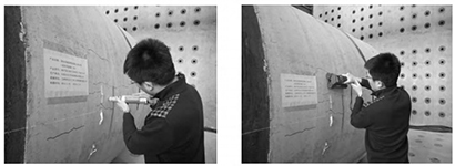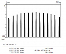 2.2 混凝土強(qiáng)度及鋼筋信息檢測(cè) 混凝土強(qiáng)度采用回彈儀進(jìn)行檢測(cè),水泥管鋼筋數(shù)量、間距及保護(hù)層厚度采用PS200鋼筋探測(cè)儀進(jìn)行檢測(cè),F(xiàn)場(chǎng)無(wú)損檢測(cè)情況見(jiàn)圖 3、圖 4,圖5為雙層縱筋保護(hù)層厚度、間距、鋼筋掃描圖像,圖中縱坐標(biāo)為保護(hù)層厚度,橫坐標(biāo)為鋼筋間距,線條為鋼筋圖像。 ![]() 圖3 回彈法檢測(cè)混凝土強(qiáng)度 圖4 鋼筋信息檢測(cè) 由于水泥管縱筋及環(huán)向鋼筋在管內(nèi)、外側(cè)均雙層配置,因此,內(nèi)外鋼筋位置、保護(hù)層等信息以圖像高低不同進(jìn)行區(qū)分,即圖像較高(保護(hù)層厚度較。橥鈧(cè)鋼筋。 ![]() 圖5 雙層縱筋保護(hù)層厚度、間距、鋼筋圖像 圖6 環(huán)向鋼筋分布 圖6為環(huán)向鋼筋信息掃描圖像,因鋼筋探測(cè)儀根據(jù)電磁感應(yīng)原理工作,檢測(cè)時(shí)探頭應(yīng)垂直于鋼筋位置,而水泥管的環(huán)向鋼筋與縱軸線有一定傾斜角度,故鋼筋檢測(cè)掃描圖像中縱坐標(biāo)保護(hù)層厚度非直線,說(shuō)明保護(hù)層厚度因角度不同存在偏差,但呈對(duì)稱分布,中間最高處為環(huán)向筋實(shí)際保護(hù)層厚度,水泥管混凝土強(qiáng)度及鋼筋檢測(cè)結(jié)果見(jiàn)表2。