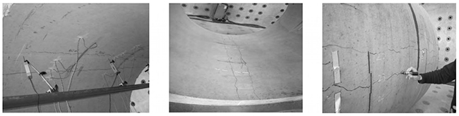 二、外壓荷載試驗(yàn) 采用“三點(diǎn)法”對(duì)水泥管進(jìn)行加載試驗(yàn),測(cè)試水泥管的裂縫荷載和破壞荷載,外壓荷載試驗(yàn)的加載裝置如圖7所示。在上承鋼梁集中一點(diǎn)加荷,通過(guò)鋼梁對(duì)試件施加均布線荷載,為保證荷載均勻,在鋼梁與試件間設(shè)置橡膠墊板,試件下方的兩個(gè)下支承梁與上承梁的軸線相互平行。規(guī)范規(guī)定裂縫寬度達(dá)到0.2mm時(shí)的荷載為管的裂縫荷載,當(dāng)試件喪失承載能力時(shí)為破壞荷載。試驗(yàn)加載速度每分鐘30kN/m,試驗(yàn)時(shí)裂縫寬度應(yīng)用裂縫測(cè)寬儀測(cè)讀,裂縫測(cè)量見(jiàn)圖8。試件加載過(guò)程中,試件內(nèi)壁頂部和底部幾乎同時(shí)開裂,內(nèi)壁頂部裂縫寬度比底部發(fā)展快,在試件的軸線附近有明顯的主裂縫。外壁水平側(cè)面相對(duì)開裂較晚,有2條明顯的主裂縫,內(nèi)壁側(cè)面未發(fā)現(xiàn)裂縫。當(dāng)加載至破壞荷載時(shí),在管口部位出現(xiàn)沿管壁的環(huán)向裂縫,并伴有炸裂聲響,說(shuō)明混凝土與鋼筋間發(fā)現(xiàn)相對(duì)滑移,試件達(dá)到極限破壞。部分裂縫分布見(jiàn)圖9,外壓荷載試驗(yàn)檢測(cè)結(jié)果見(jiàn)表3。 ![]() ![]() 圖7 試驗(yàn)加載 圖8 裂縫寬度測(cè)量 ![]() 圖9 管頂、管底、管側(cè)向裂縫分布