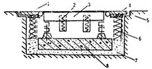 2. 隔振措施 振動(dòng)員噪聲除了通過(guò)空氣傳播外,也能通過(guò)墻和基礎(chǔ)傳播,我們采用二次隔振措施:1. 振動(dòng)臺(tái)框架與底座基礎(chǔ)間采用中等硬度橡膠作隔振器;2. 底座基礎(chǔ)與坑底地面采用“浮隔”法處理(見(jiàn)圖2)。 ![]() 圖2 混合隔振系統(tǒng)示意圖 1. 振動(dòng)臺(tái)框架;2. 隔振材料;3. 附加重量(活動(dòng)基礎(chǔ)塊);4. 松散緩沖隔離層(砂+木屑);